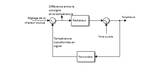 le système reçoive l'information de température. Ainsi, lorsque la température sera au dessus de celle voulue, il en recevra l'information et se régulera de lui-même : le climatiseur est né.Du coup, plus besoin de se lever pour actionner la molette, le système se régule de lui même. Pratique n'est-ce pas ? Il est maintenant nécessaire de connaître